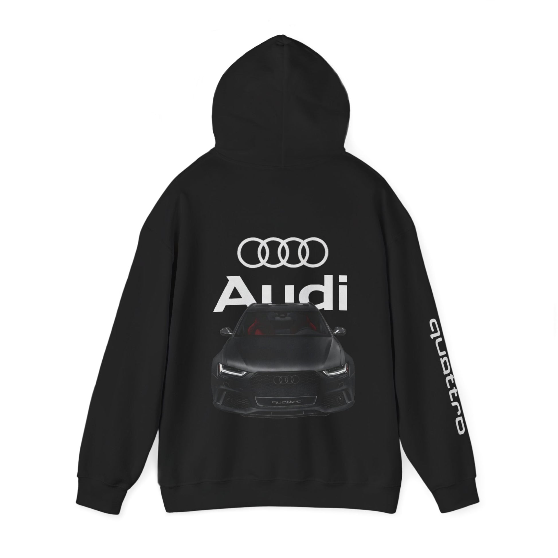 This premium black hoodie features an aggressive Audi front-end design layered over bold Audi typography, finished with the iconic rings and quattro sleeve detail for a clean motorsport look.